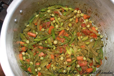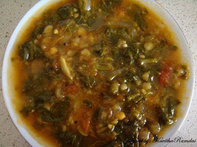 Pressure cooks the chopped spinah leaves along with the thoor dhal, onions, green chilli, tomatoes, chilli powder, tamarind, and turmeric powder. Add some water to cook.