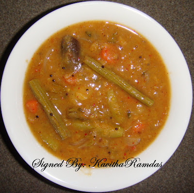 In a pan add cooked vegitables and dal in a medium heat. Add tamarind paste,sambar powder and salt. bring it to boil. Then add fried onion.