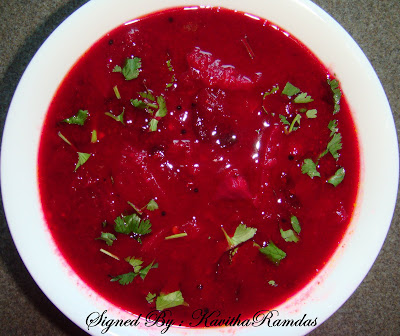 Cook Toor Dal, beetroot, Green chilli, Tomato and Turmeric powder with sufficient water in a pressure cooker till 1 or 2 whistles.