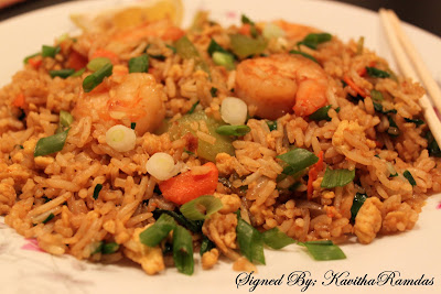 Then add shrimp fry for few mints. then add rice, soy sauce and dark soy sauce. then add salt, sugar and garlic powder and mix well.