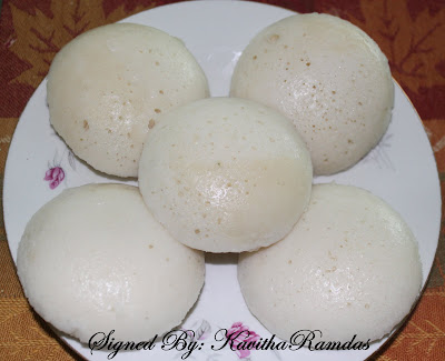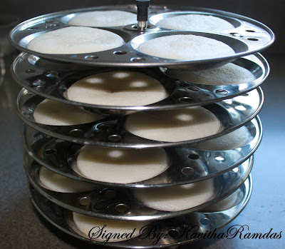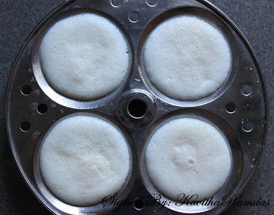 Heat 2 cups of water in a large vessel or pressure cooker and place the filled idli plates and cover with lid. Heat in high for about 20 minutes.