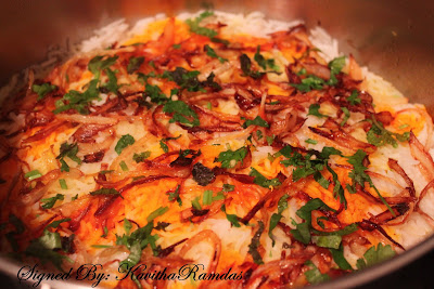 Next soak the rice for about 15 mints. Then in a pan add water, oil and salt to taste. Drain the excess amount of water and add it to the boiling water. Cook the rice till it is half done. then remove immedietly and strain it out. Take a dish which is deeper, put the marinated chicken and level it up. Take a spoon and nog it on the top, to make a nice leavel. Then cook it for about 15 mints with lid. To this take half cooked rice and sprinkle on top and nicely spread the rice. Then add Coriander leaves, mint leaves, fried onion and Safron water on top. Then Put a tight lid. Cook it for 30 mints, 5 mints at high flame, 15 mints at medium, 10 mints in law heat.