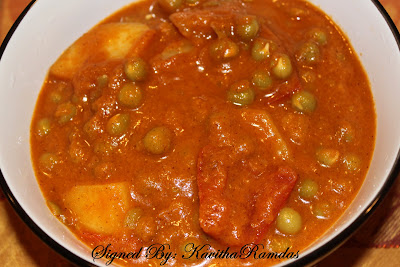 In a pan boil potato and peas using water and little salt. After potato and peas are boiled, then add blended mixture, tomatoe and salt. Mix well.